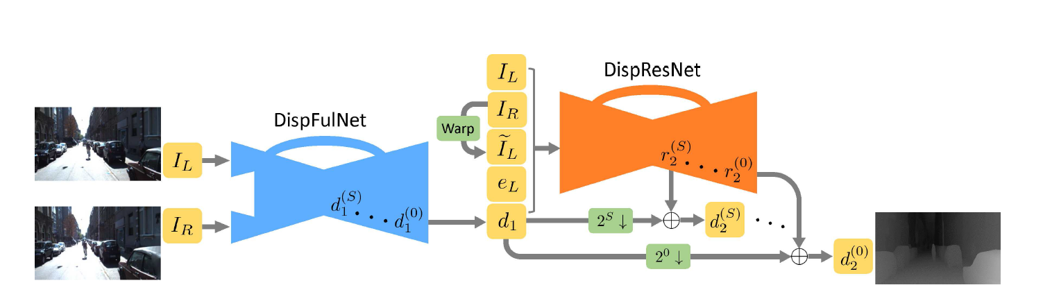 接下来就是第二阶段,将\(I_L\),\(I_R\),\(\tilde{I}_L\),\(d_1\)以及\(e_L=|I_L-\tilde{I}_L|\)串联起来2作为dispResNet的输入。此优化网络最后学到的是多尺度的残差\(\{r_2^{(s)} \} _s^S\),其中s=0时表示全尺度残差。最后与DispFulNet输出的多尺度深度图\(\{d_1^{(s)}\}_s^S\)做和运算得到最后优化后的深度\(\{d_2^{(s)}\}_s^S\)\(d_2^{(s)}=d_1^{(s)}+r_2^{(s)},0 \leq s \leq S\) 于是\(d_2^{(0)}\)就是最后的全尺度输出。