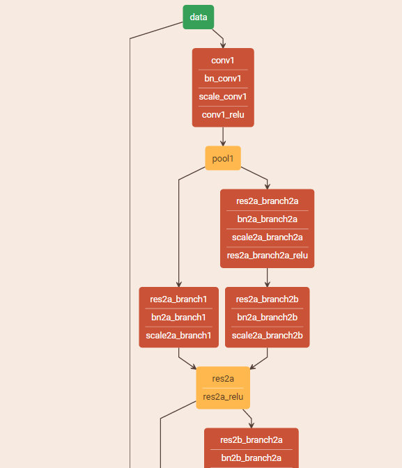 接下来,为了验证下这个DL工具包的强大之处,我打算纯手工建一个Resnet。为方便起见,我搭了一个Resnet34(更深的网络敬请期待吧)。这里是它的prototxt,我们可以用网络可视化工具进行查看resnet34的结构。以下是Resnet34的一部分(太长了没有截下全部视图)。