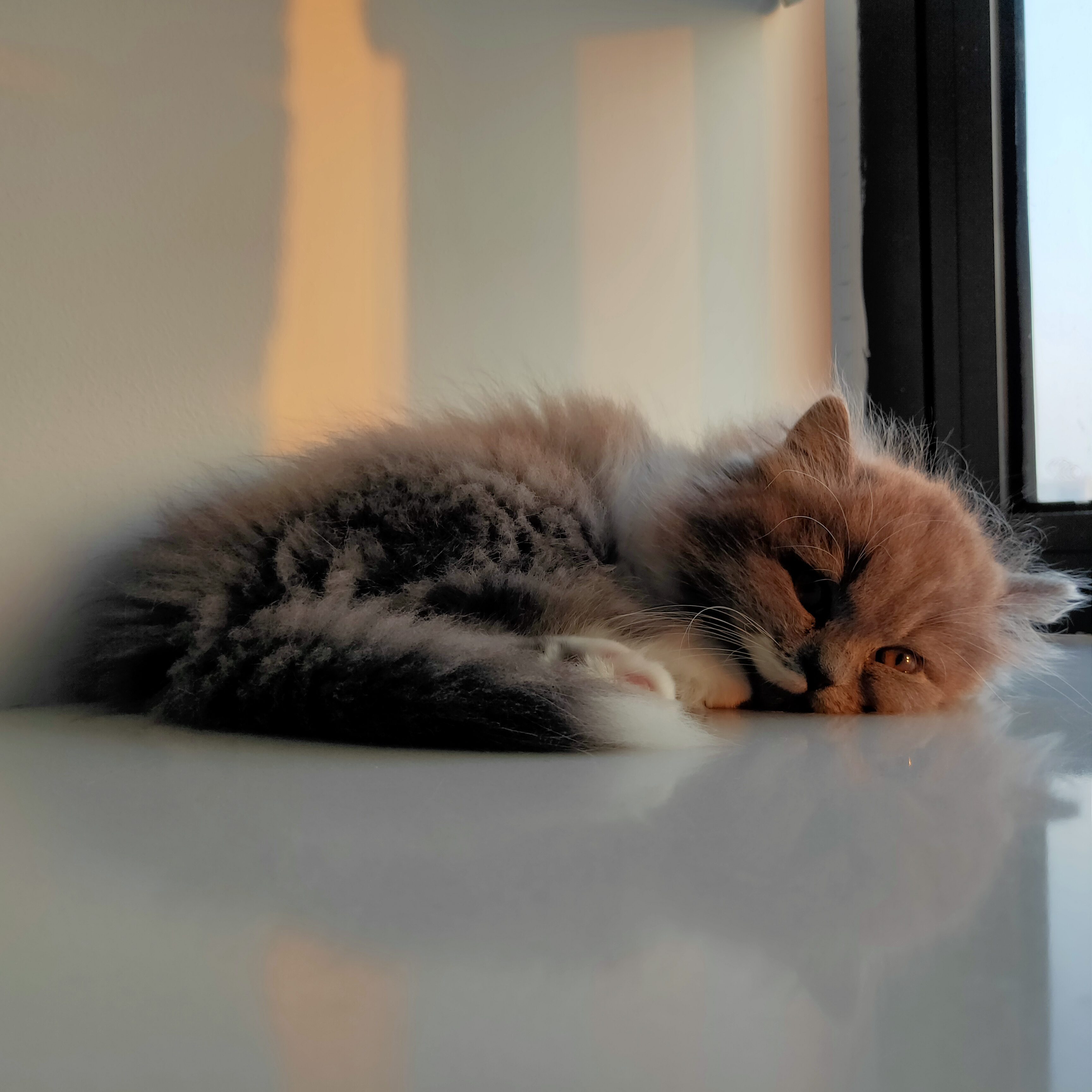 2020年10月6日,接回了mango。小家伙突然来到新的环境有点害怕,躲在角落,一天没有吃饭。过了一天之后就慢慢变好了,该吃吃该喝喝。今天下午,它爬上阳台睡着了,我用手机拍了几张猛兽照。