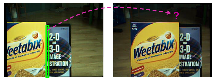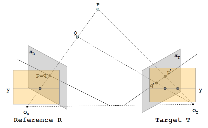对于双目相机,\(O_R\)\(O_T\)分别是左右相机的光学中心,对于在参考相机像平面上被汇聚的两点(p和q),在目标相机像平面上会被区分开来,那么我们可以找到双目或者多目相机中匹配的点利用三角相似原理来估计深度。那么我们怎么寻找相对应的点呢?一个直观的想法就是固定两幅图中的一幅,然后在另外一幅图中 进行2D范围的搜索匹配点。
