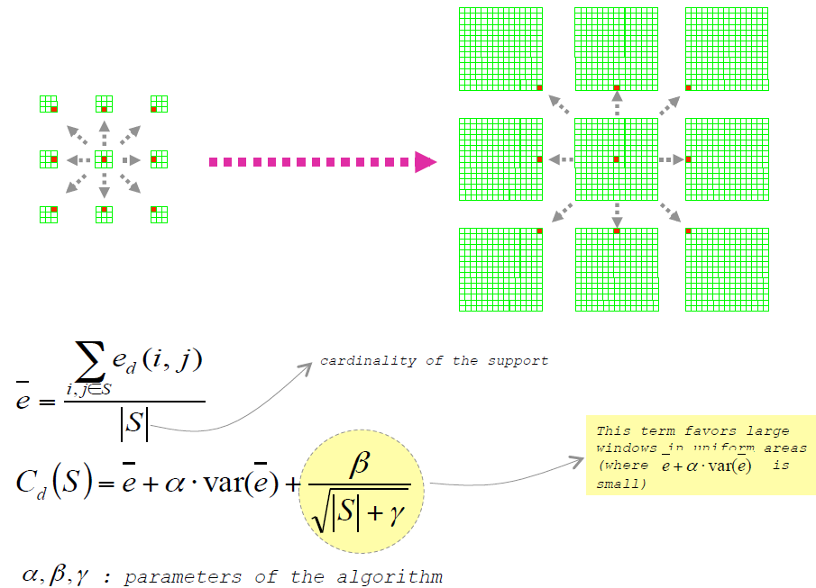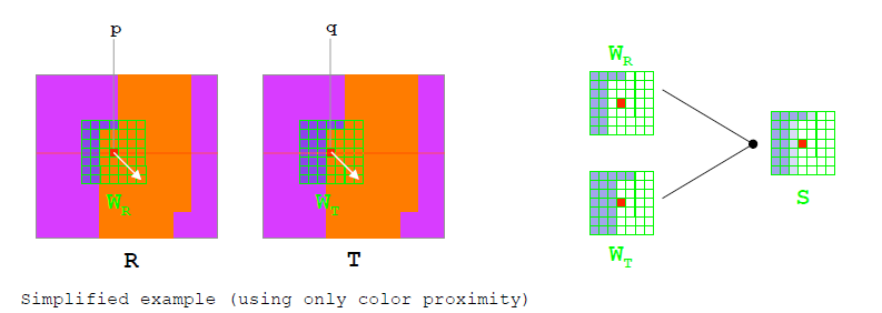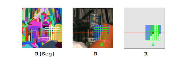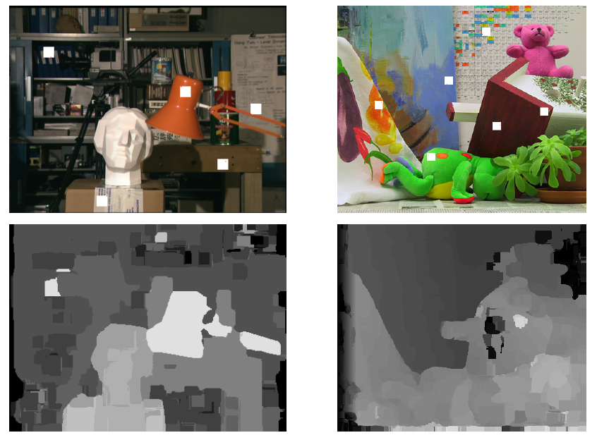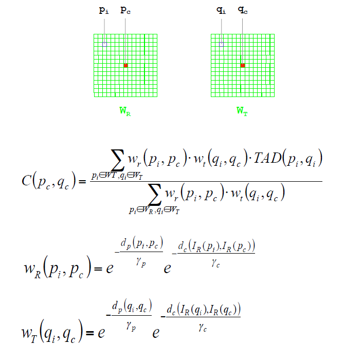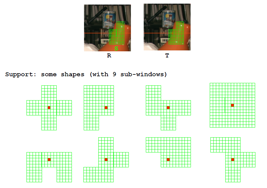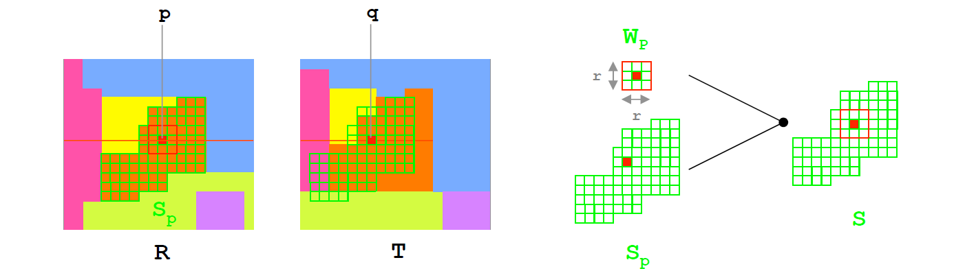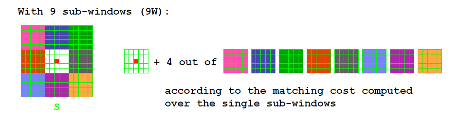 • 支持域覆盖整个分割块 \[C_{agg}(p,q,d)=\frac{C_S(p,q,d)}{|S_p|}+\frac{C_W(p,q,d)}{|r^2|}\] \[C_S(p,q,d)=\sum_{p_i \in S_p}{TAD(p_i,q_{i+d})}\] \[C_W(p,q,d)=\sum_{p_i \in W_p}{TAD(p_i,q_{i+d})}\] 其中\(C_W\)为了消除“分割锁定”,这一项可能在纹理稠密的区域很有帮助,但是这一项有可能带来深度的不连续性。