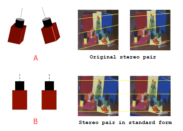 可以发现相机的摆放姿势影响着扫描线的方向。在上图A中,相机与水平呈一定角度地摆放,其扫描线为右图所示,同样是与水平倾斜的扫描线。假如两个相机平行摆放的话,其拍出来匹配对是扫描线已经对齐了的。