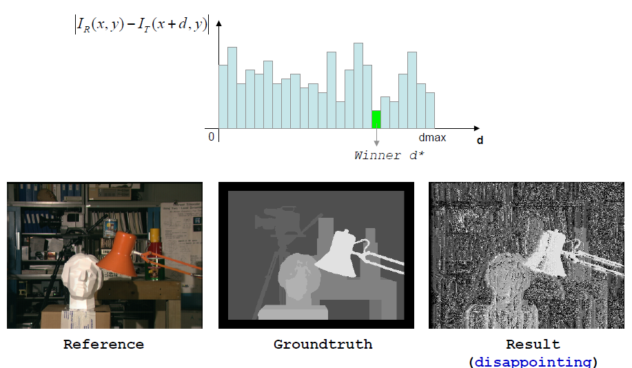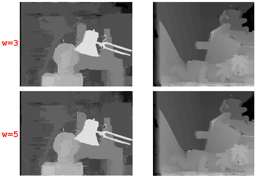 • 局部算法。同样是利用到了简单的WTA提取到初始视差,但是通过计算窗口内的损失量提高了信噪比。有时需会加入平滑项。Steps 1+2 (+ WTA)