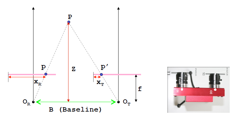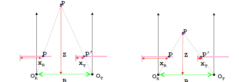 其中,\(x_R-x_T\)就是视差,Z表示深度,B为基线,f是焦距。