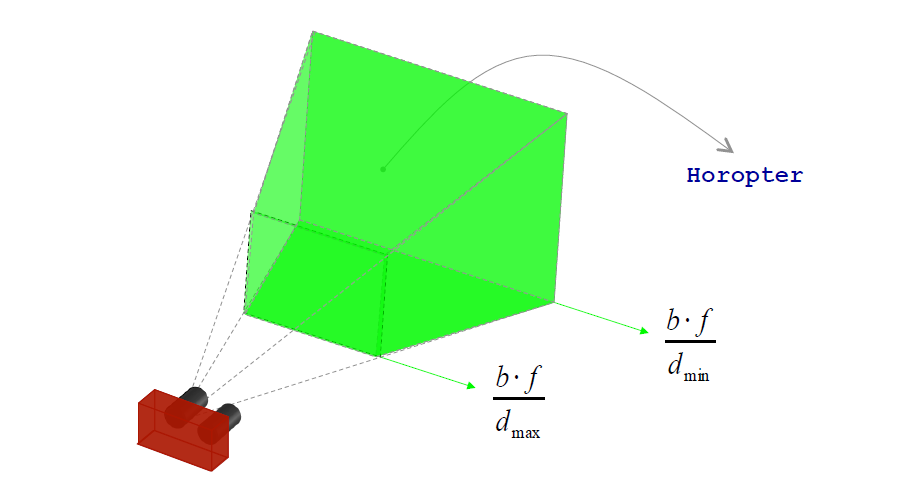 图为双摄装置,基线为b,焦距为f,那么双摄的视界被视差范围所限定{\(d_{min},d_{max}\)},如图中绿色包裹的区域。