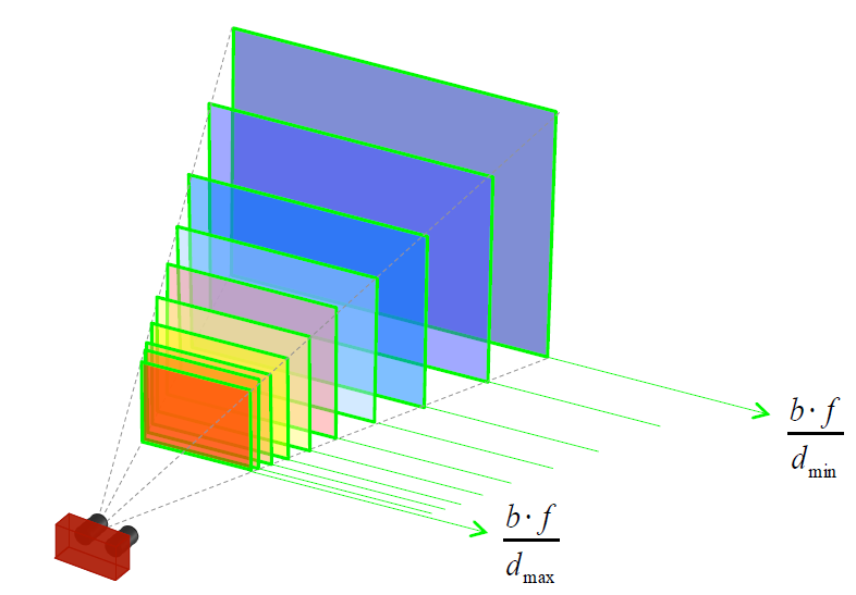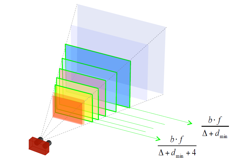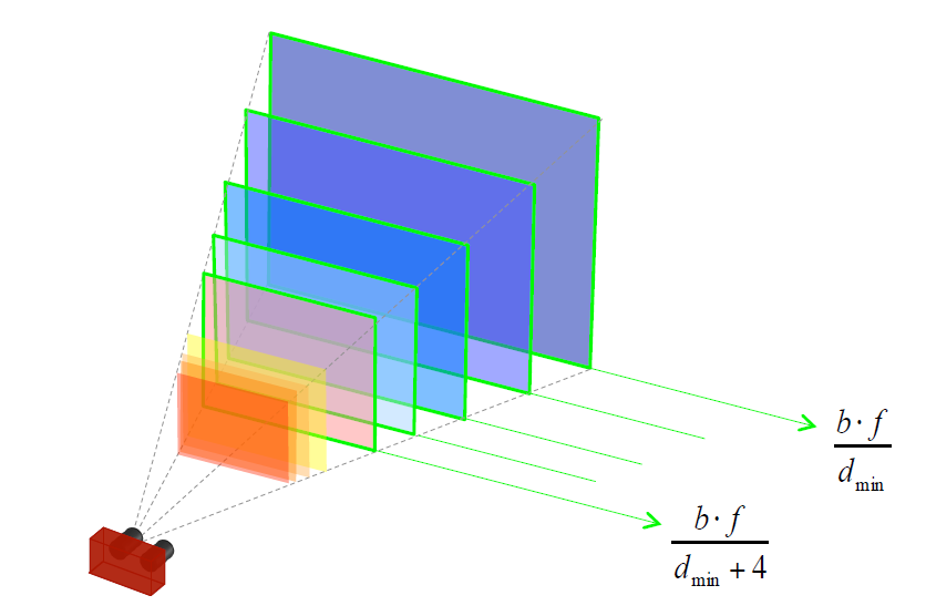 • 深度是通过利用立体匹配系统将视差离散成一系列平行的平面来测量的;每一层平面对应着一个视差。