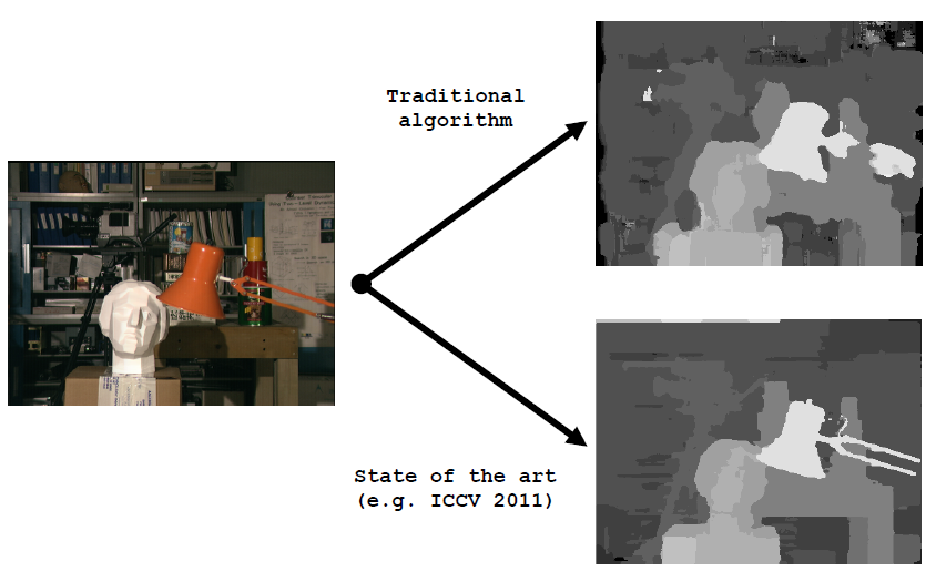 图中为传统算法以及ICCV2011当时最好的结果。可以发现,能够达到较好的视差是具有挑战性的。下面将要展示视差估计的基本流程。