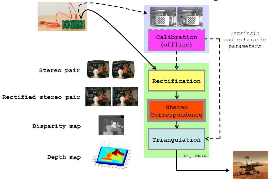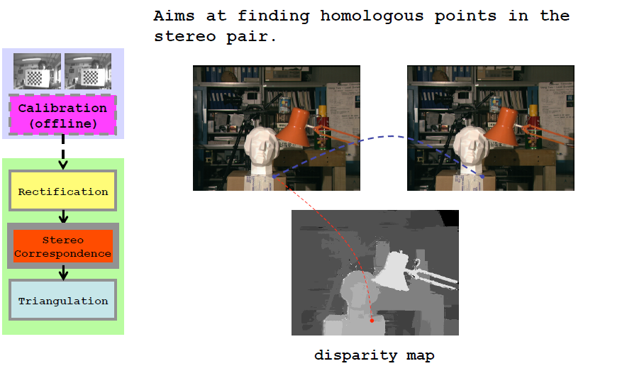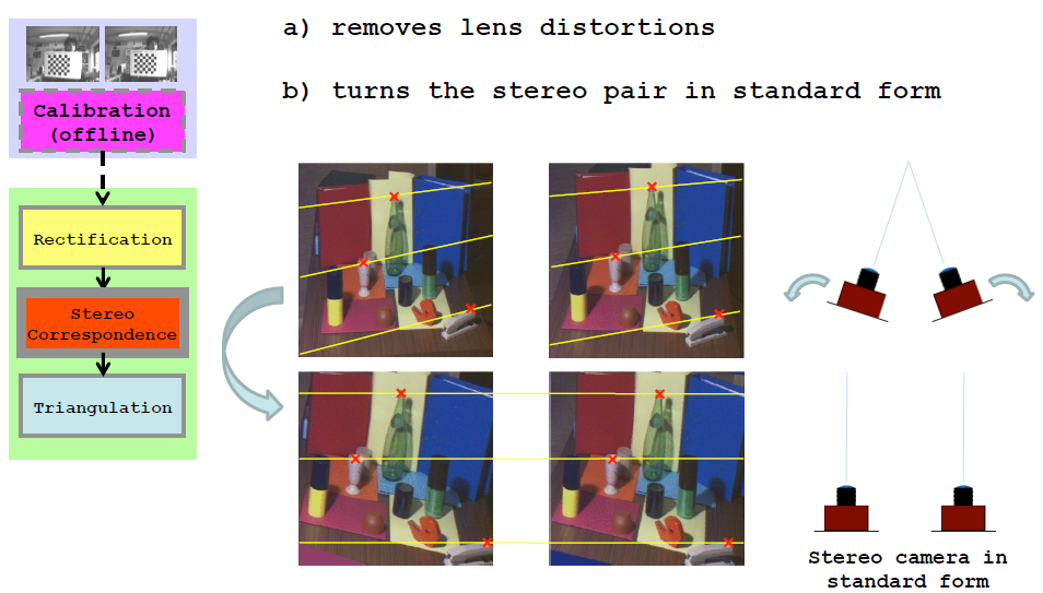 通过双摄设备采集图像,此时图像是存在镜头畸变的,在进行扫描线对齐之前要进行离线标定以消除镜头畸变。扫描线对齐的过程叫做镜头矫正(rectificaition),经过这步之后就可以进行1D的匹配点搜索(stereo correspondence)了。随后通过三角形相似原理得到相应的深度/视差图。
