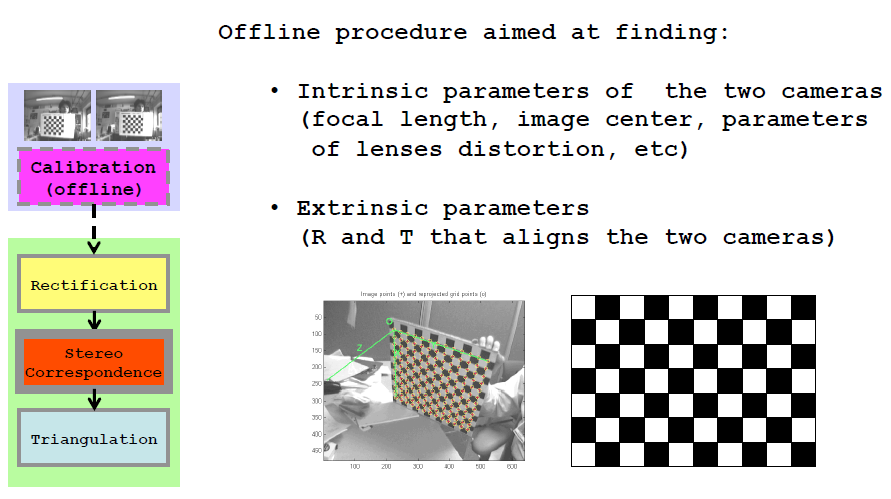 标定的目标是寻找: - 相机内参:焦距、图像中心、镜头畸变参数 - 相机外参:排列相机使其对齐的参数