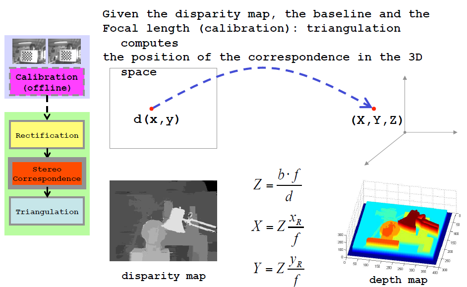给定视差图像,基线长度以及焦距可以通过三角计算得到当前位置对应的3D位置。