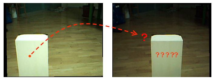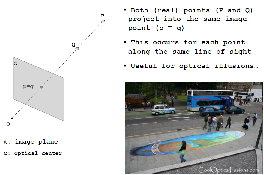 如图所示的是单目摄像机的拍摄原理,右侧实际场景可以抽象成左侧的模型。可以发现场景中的P点与Q点会同时汇聚在成像平面中的一点,同样遮挡问题出现在PQ连线的所有点。