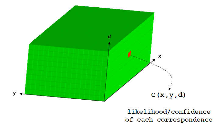 视差空间图像(DSI)是一个如下图所示张量\(W\times H\times(d_{max}-d_{min})\),其中的每一个元素\(C(x,y,d)\)表示\(I_R(x_R,y)\)\(I_T(x_R+d,y)\)之间的匹配度。