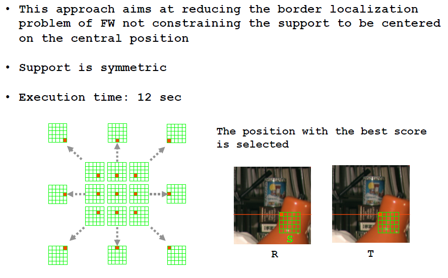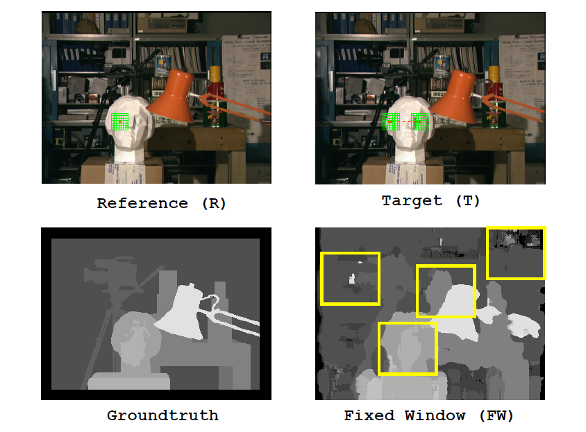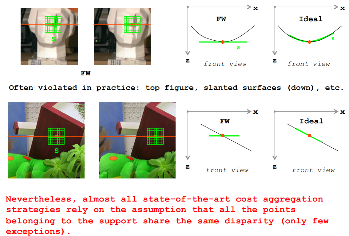 目前最好的损失聚合算法都在想方设法地改变支持域的形状以适应在仅在相同的已知视差上做匹配。对于FW而言,就是减小其窗口大小,来减少边界定位问题。但是与此同时,这个改变使得匹配问题变得含糊不清,特别是对于有重复区域以及平滑区域的情形。