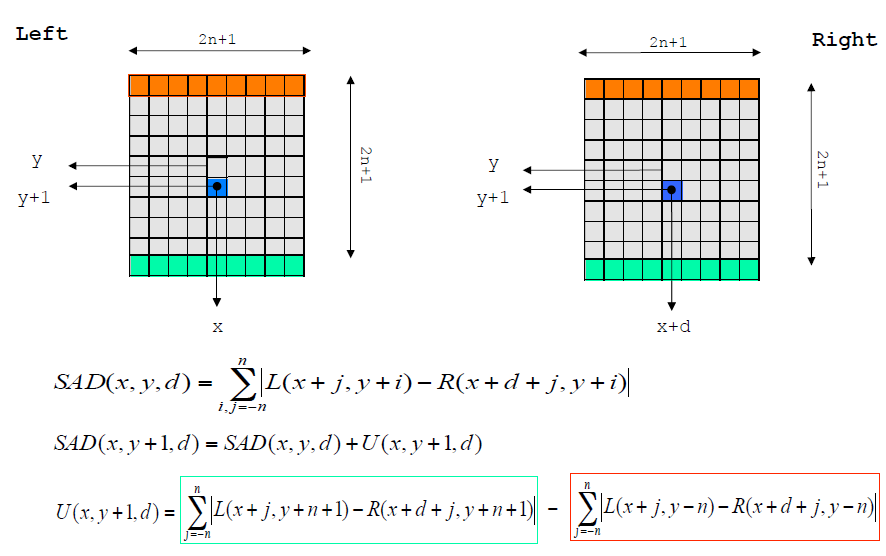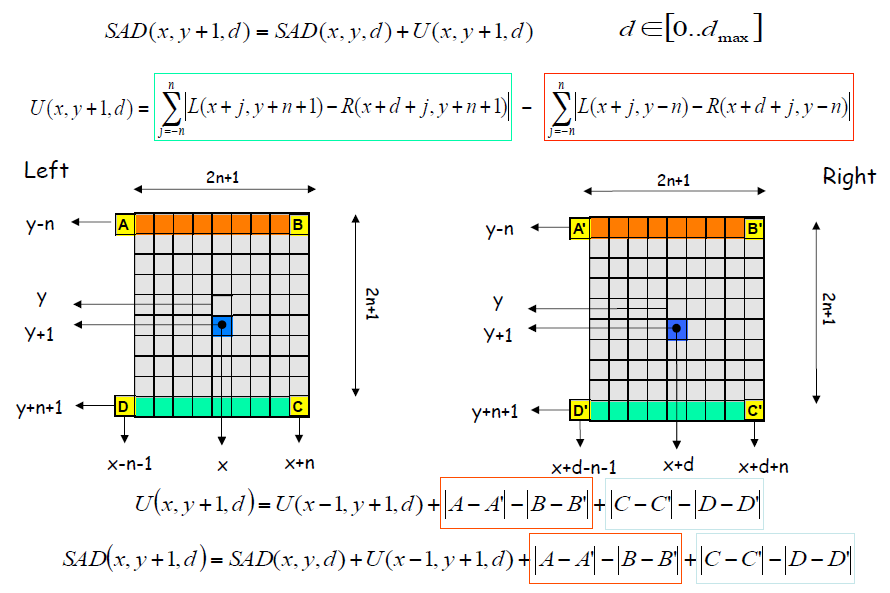 • 绝对误差和(Sum of Absolute differences (SAD)) \[C(x,y,d)=\sum_{x\in S}|I_R(x,y)-I_T(x+d,y)|\]