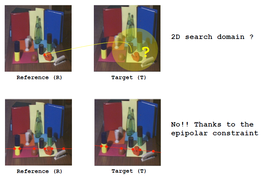 但实际情况这样做的代价非常大。不过多亏了有极线约束,我们可以在图像的1D范围上进行搜索。以下将要对极线约束进行解释。