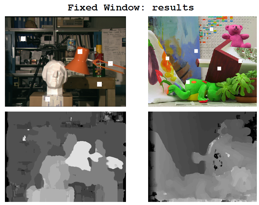 那么从最简单的固定窗口(FW)损失聚合开始,以下为利用FW聚合的TAD损失然后利用WTA得到的深度图。理想是完美的,但现实是骨感的,可以看到下图给出的结果并不佳,这是什么原因呢? a. 隐含地假设前额表面处于同一视差 b. 忽略了深度的非连续性 c. 平坦区域的处理不佳 d. 重复的区域