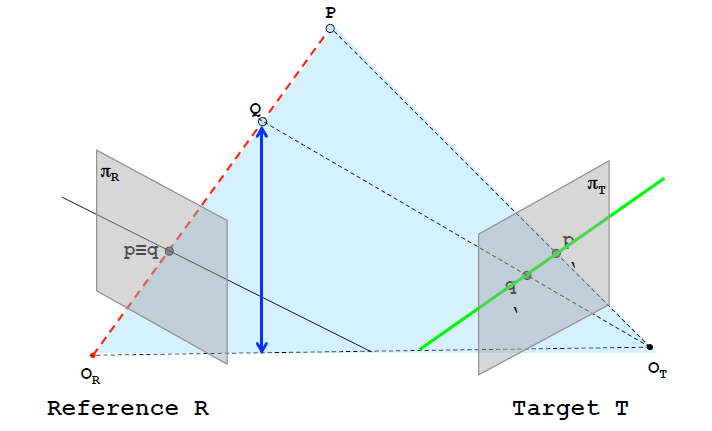 - 对于参考图像R而言,现实场景中的P与Q点在其像平面\({\pi}_R\)上被投影成为一个点p=q。 - 极线约束规定,属于(红色)视线的点对应位于目标图像T的图像平面\({\pi}_T\)上的绿线上。
